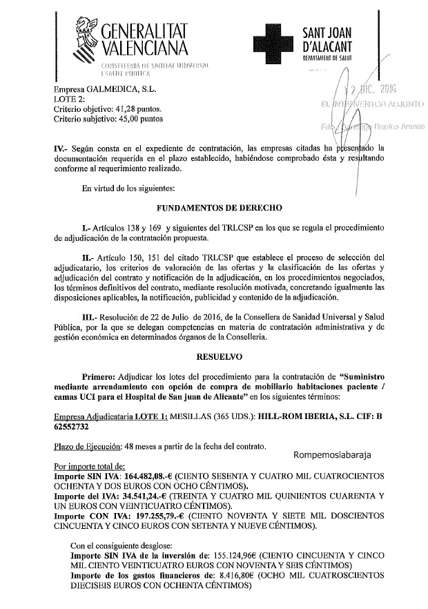 Adjudicado a la empresa HILL ROM IBERIA S.L.